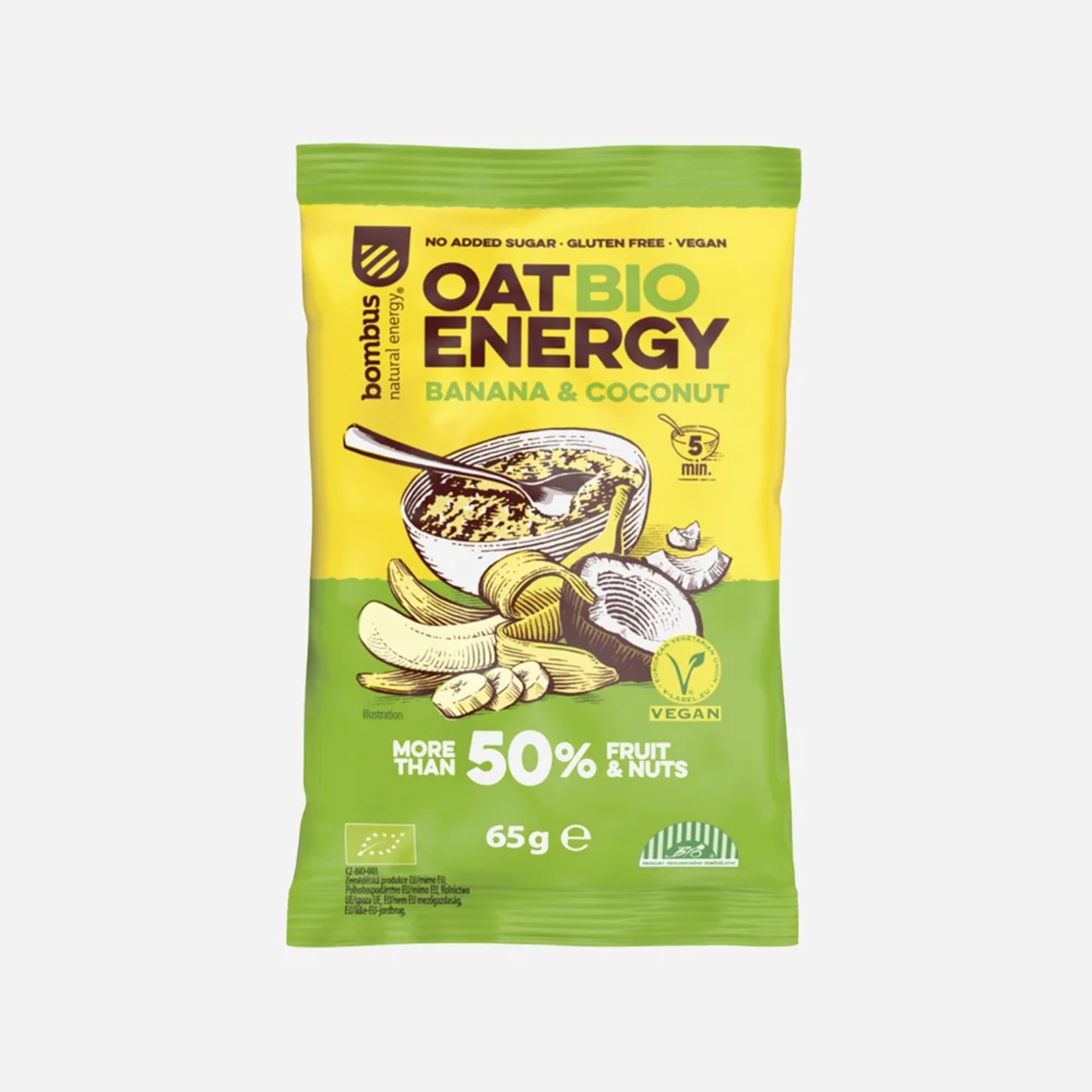 Bezglutenowa owsianka BIO z ponad 50% owocami i orzechami w sprawdzonej kombinacji smaków banana i kokosa. Produkt czeskiej marki Bombus