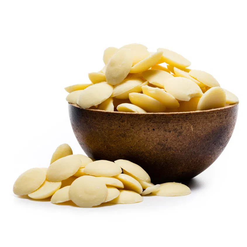 Cechy i zalety: Możesz używać białej czekolady w postaci ciast, szczególnie do produkcji piekarniczej i cukierniczej. Ma temperaturę topnienia od 31 do 35 stopni. Zawiera wysoki procent masła kakaowego (29%). To zupełnie wyjątkowy tłuszcz roślinny tłoczony z ziaren kakaowych, który w przeciwieństwie do innych tłuszczów roślinnych nie jełczeje. Jednocześnie zawiera dużą ilość przeciwutleniaczy, minerałów i zdrowych tłuszczów, które są jakościowym źródłem szybkiej energii.