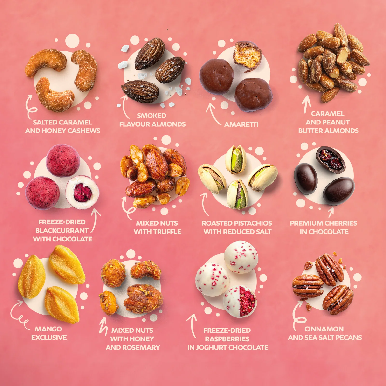 Pudełko prezentowe zawiera wyśmienite kombinacje orzechów w słonym karmelu, prażonych pistacji, migdałów z wędzonym aromatem i innych specjałów. Miłośnicy słodyczy będą zachwyceni wiśniami w gorzkiej czekoladzie, liofilizowanymi porzeczkami w czekoladzie lub delikatnymi ciasteczkami Amaretti. Wyjątkowe połączenie smaków dopełniają pekany z cynamonem, mango exclusive i mieszanka orzechów z aromatem trufli.