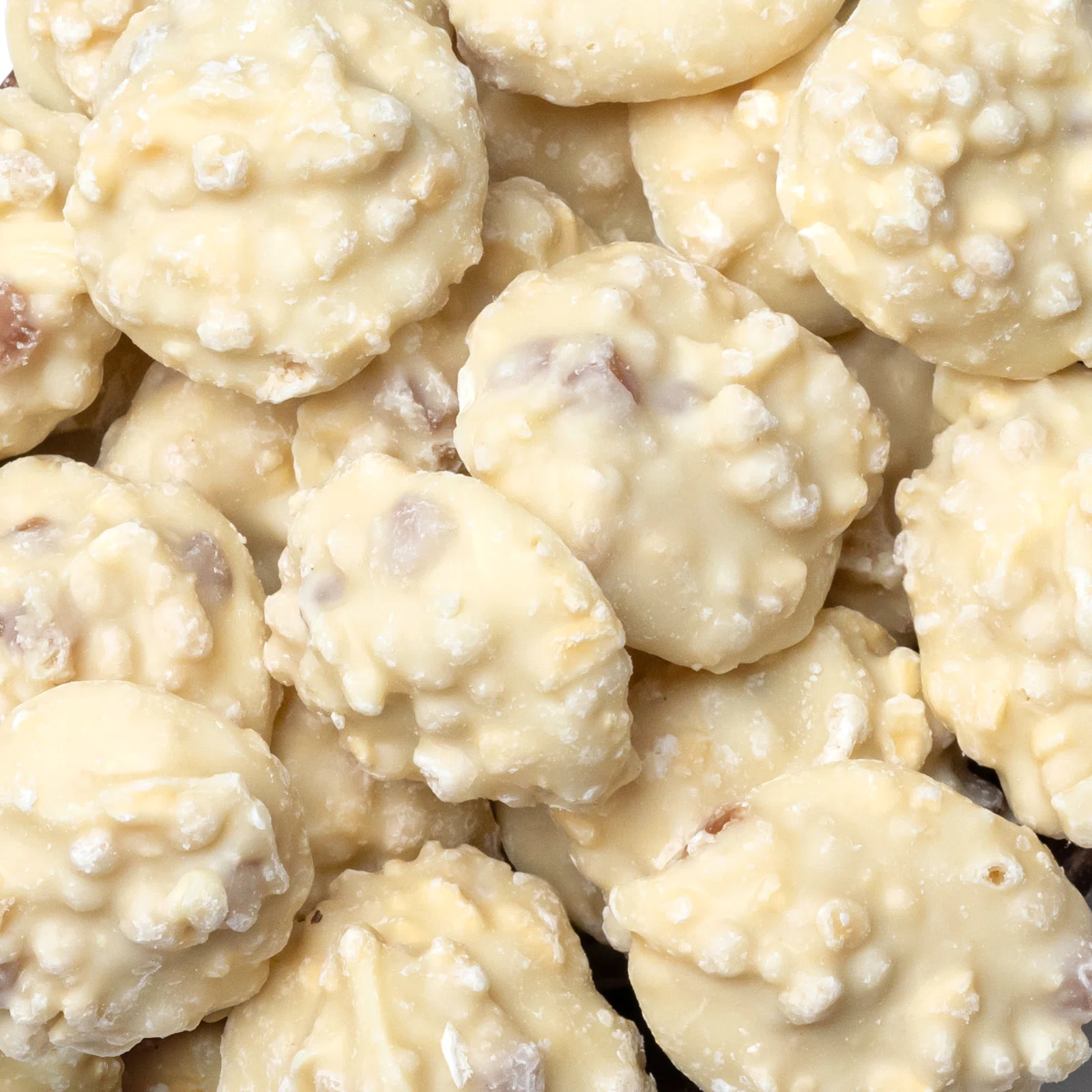 Składniki: | biała czekolada 75 % (cukier, masło kakaowe, pełne mleko w proszku, serwatka w proszku (mleko), naturalny aromat waniliowy, emulgator: lecytyna sojowa); chrupki ryżowe 10 % (mąka ryżowa, słód pszenny), mango 8 % (przecier z mango, cukier, przecier jabłkowy, syrop fruktozowy, mąka ryżowa, masło kakaowe, naturalny aromat, substancja żelująca: E440; regulator kwasowości: E330, błonnik cytrusowy), kawałki marakui (maltodekstryna, marakuja, naturalny aromat, regulator kwasowości: E330), proszek jogurtowy, aromat jogurtowy. |