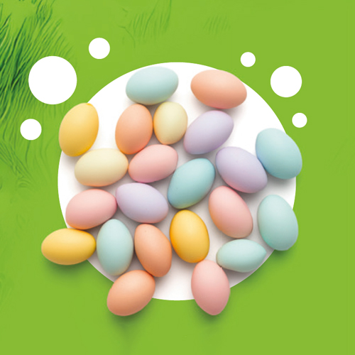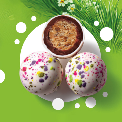 WIELKANOCNE CHRUPIĄCE DRAŻETKI. Chrupiące kulki zbożowe w czekoladzie mlecznej i polewie cukrowej. Składniki: Czekolada mleczna 52 % (cukier, pełne mleko w proszku, masło kakaowe, miazga kakaowa, emulgatory: lecytyny sojowe; naturalny aromat waniliowy, sucha masa kakaowa: min. 32 %), cukier 35 %, chrupiący rdzeń zbożowy 11 % (mąka pszenna, mąka pszenna pełnoziarnista, cukier, gluten pszenny, mąka pszenna słodowa, sól, substancja spulchniająca: wodorowęglan sodu), skrobia ryżowa, stabilizatory: guma arabska, estry sacharozy z kwasami tłuszczowymi; barwniki: karoteny, kurkumina, ekstrakt ze spiruliny, karminy; maltodekstryna; substancja glazurująca: wosk carnauba. Może zawierać śladowe ilości orzeszków ziemnych i orzechów. Wartości odżywcze na 100 g: Wartość Energetyczna 1982 kJ/ 472 kcal; Tłuszcz 17,2 g, w tym kwasy tłuszczowe nasycone 10,5 g; Węglowodany 74 g, w tym cukry 65 g; Błonnik 2,2 g; Białko 4,4 g; Sól 0,25 g.