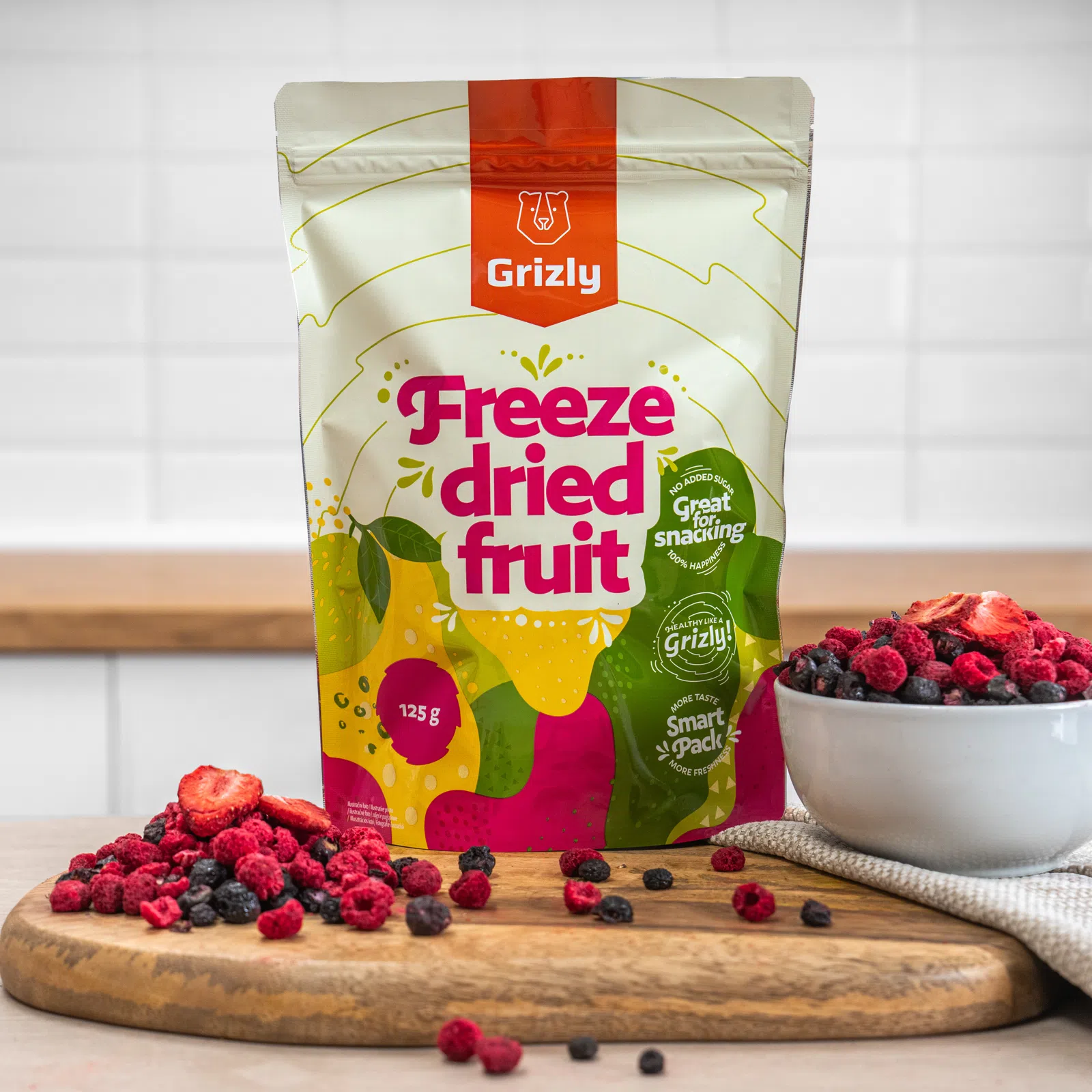 | Skład: | truskawki liofilizowane 42 %, maliny liofilizowane 42 %, borówki liofilizowane 16 % |