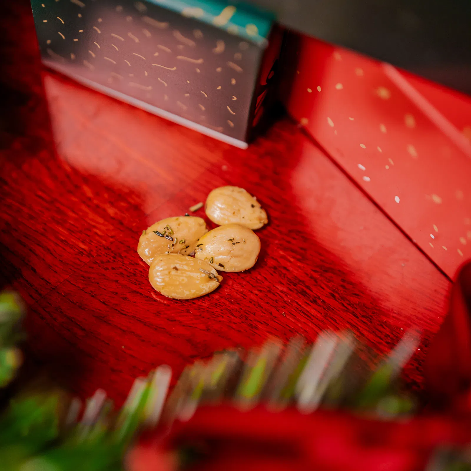 Chrupiące migdały ziołowe zapakowane w piękne opakowanie z motywem świątecznym przyniosą dużo radości, i to nie tylko pod choinką.