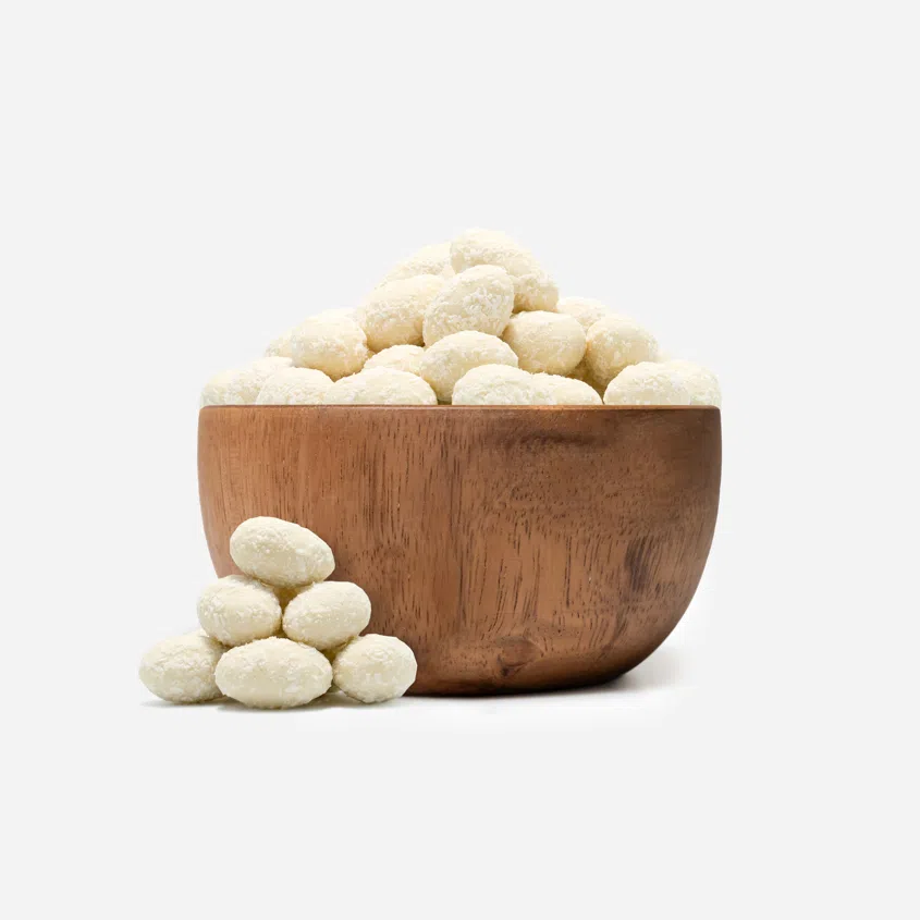 Starannie wybrane migdały w wysokiej jakości białej czekoladzie i chrupiącym kokosie.
