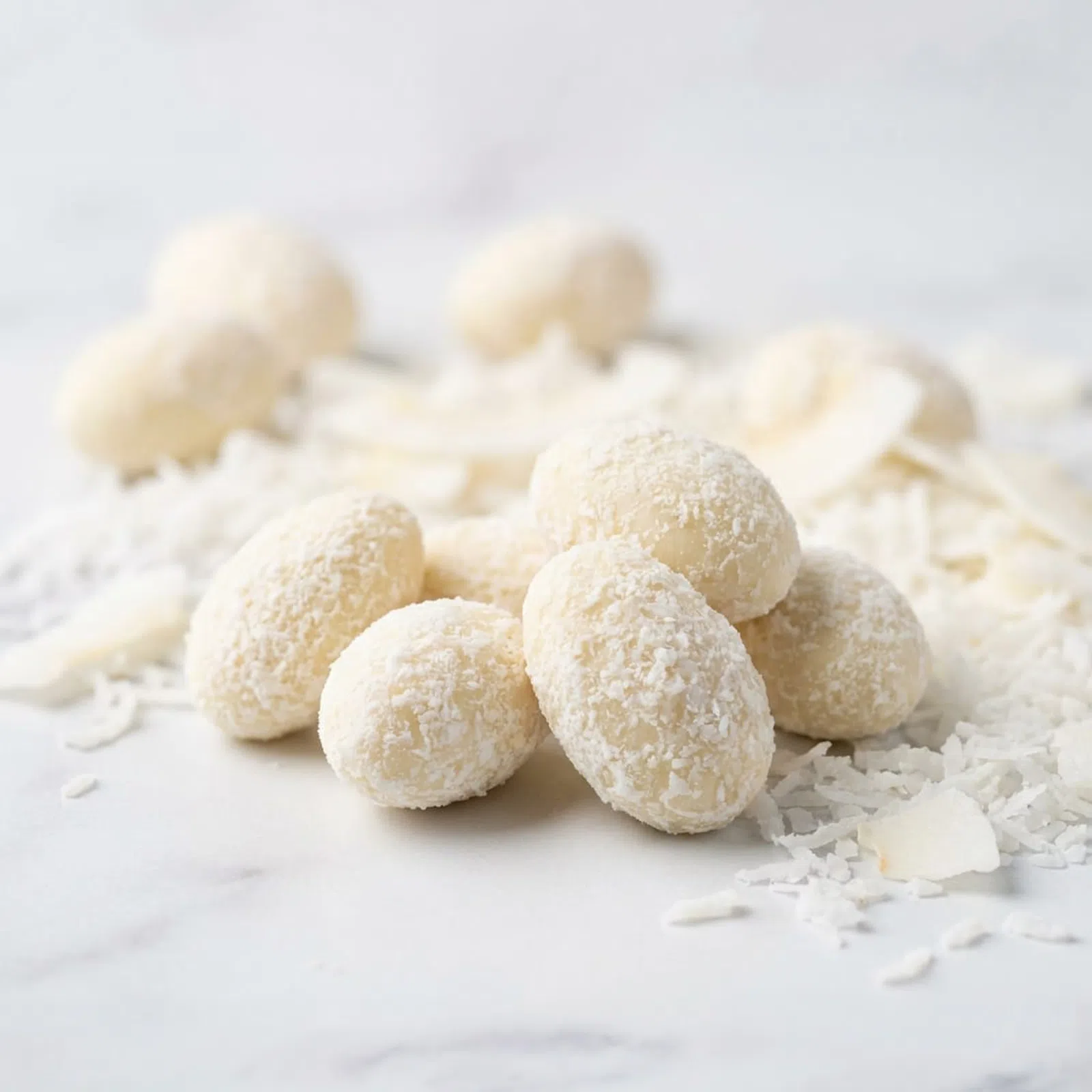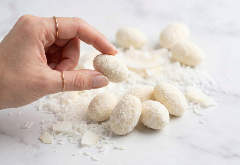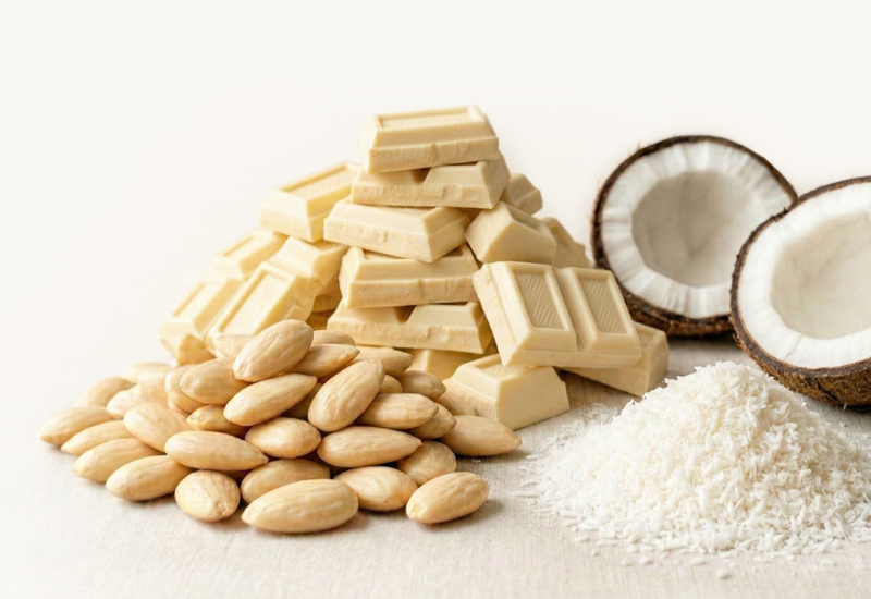 Starannie wybrane migdały w wysokiej jakości białej czekoladzie i chrupiącym kokosie.