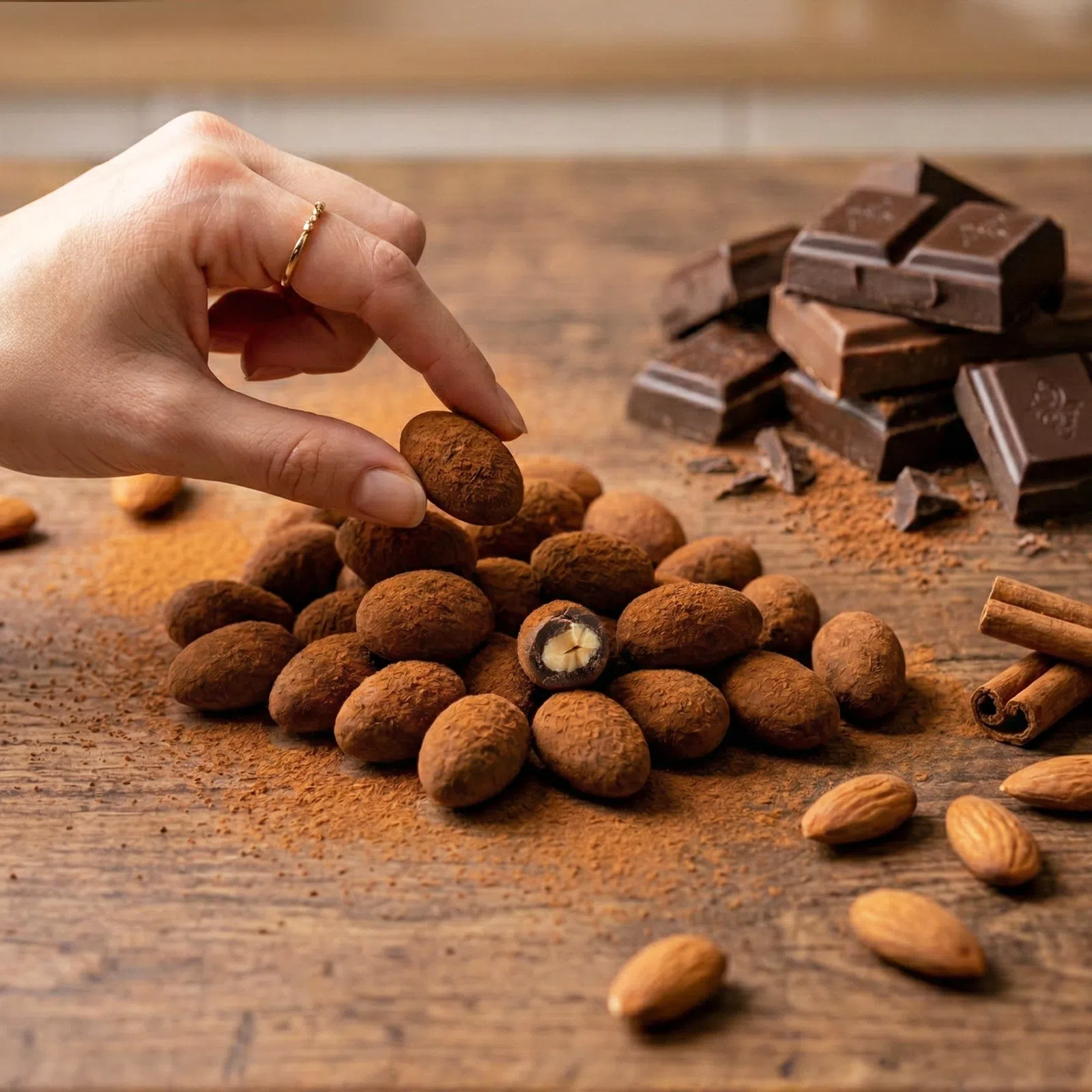 | Składniki: | czekolada mleczna 67% (cukier, pełne mleko w proszku, masa kakaowa, masło kakaowe, serwatka w proszku, naturalny aromat waniliowy, emulgator: lecytyna sojowa); migdały 30% (migdały, olej słonecznikowy), cynamon 2%, syrop glukozowy, dekstryna z tapioki, substancja glazurująca: guma arabska. |