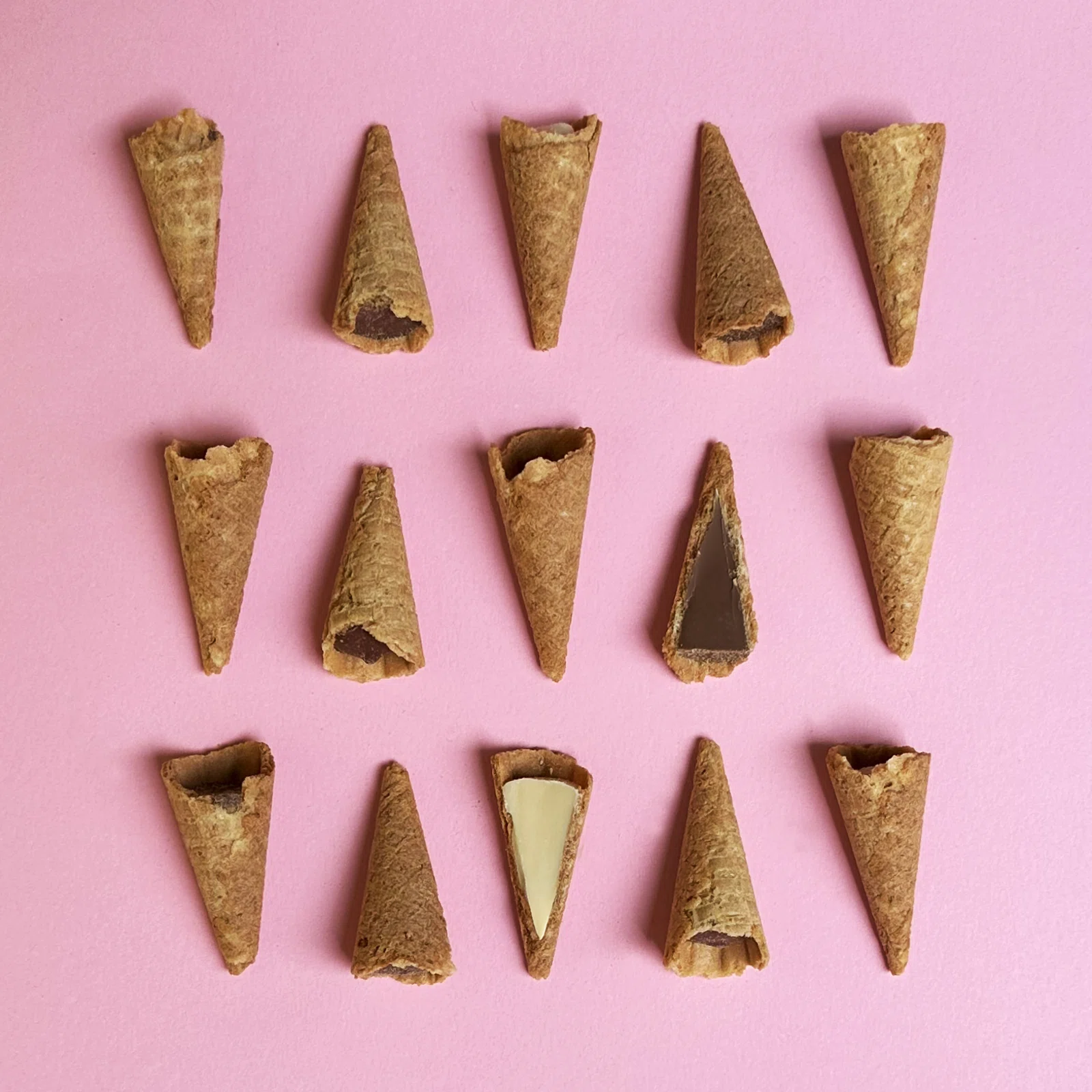Coś małego do podjadania, kiedy najdzie Cię ochota na coś słodkiego. Dokładnie to spełniają nasze mini rożki orzechowe. Możesz sobie je wyobrazić jako tę czubek rożka lodowego, która zostaje jako ostatnia z całych lodów. Zwykle wszyscy na nią czekają, bo to taki słodki, zmysłowy finał. A ponieważ lubimy ulepszać już dobre rzeczy do absolutnej perfekcji, wypełniliśmy te małe rożki aż po brzegi orzechową czekoladą i przygotowaliśmy cały worek. Nie musisz się wahać, jedz ile chcesz, bo rożki są wykonane z zrównoważonego kakao i wysokiej jakości czekolady. Co więcej, w składzie nie znajdziesz oleju palmowego. Orzechowy smak to oczywiście nie wszystko – w ofercie mamy też rożki z mleczną i białą czekoladą.