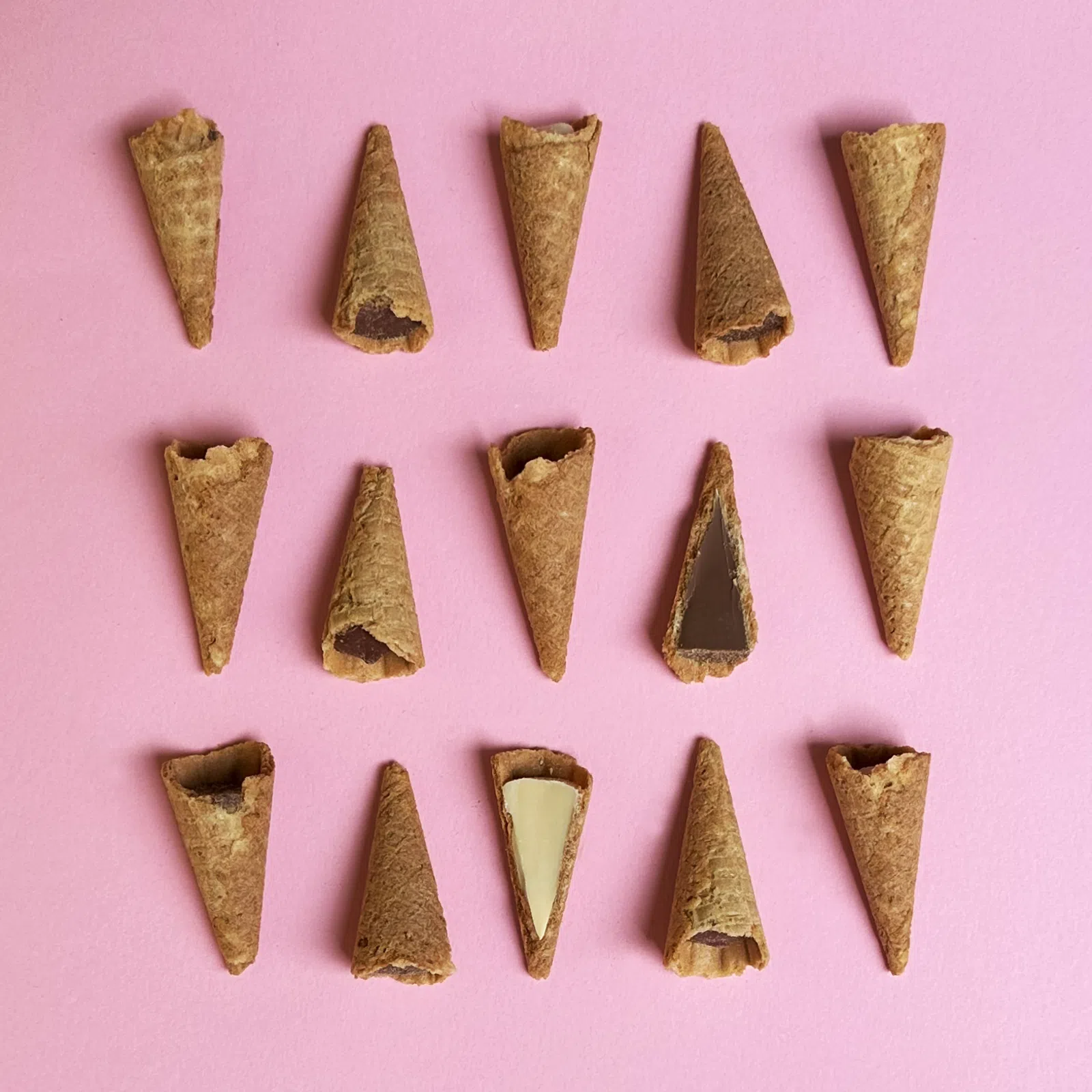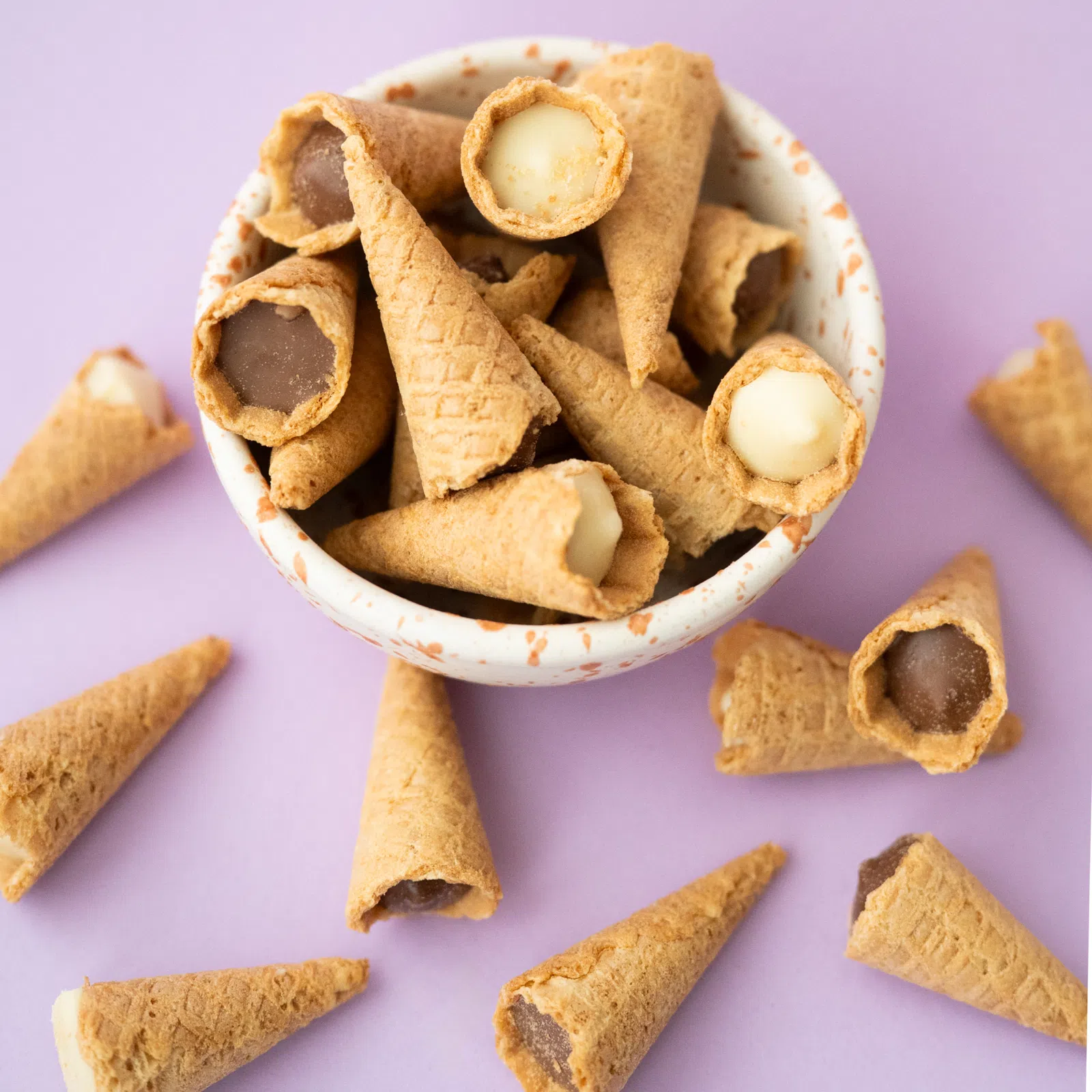 Po prostu coś małego na przekąskę, kiedy niespodziewanie dopadnie cię ochota na coś słodkiego. Idealnie sprawdzą się tutaj nasze mini rożki ze słonym karmelem. Możesz wyobrazić je sobie jako tę czubek rożka lodowego, który zostaje na sam koniec i na który wszyscy czekają – to taka słodka, zmysłowa końcówka. A ponieważ lubimy udoskonalać dobre rzeczy do absolutnej perfekcji, wypełniliśmy te małe rożki po brzegi słonym karmelem i przygotowaliśmy całą paczkę. Nie krępuj się – jedz ile tylko chcesz, bo rożki są zrobione z wysokiej jakości karmelu. Dodatkowo w ich składzie nie znajdziesz oleju palmowego. Smak słonego karmelu nie jest jedyną opcją – w naszej ofercie mamy również rożki z mleczną, gorzką oraz białą czekoladą.