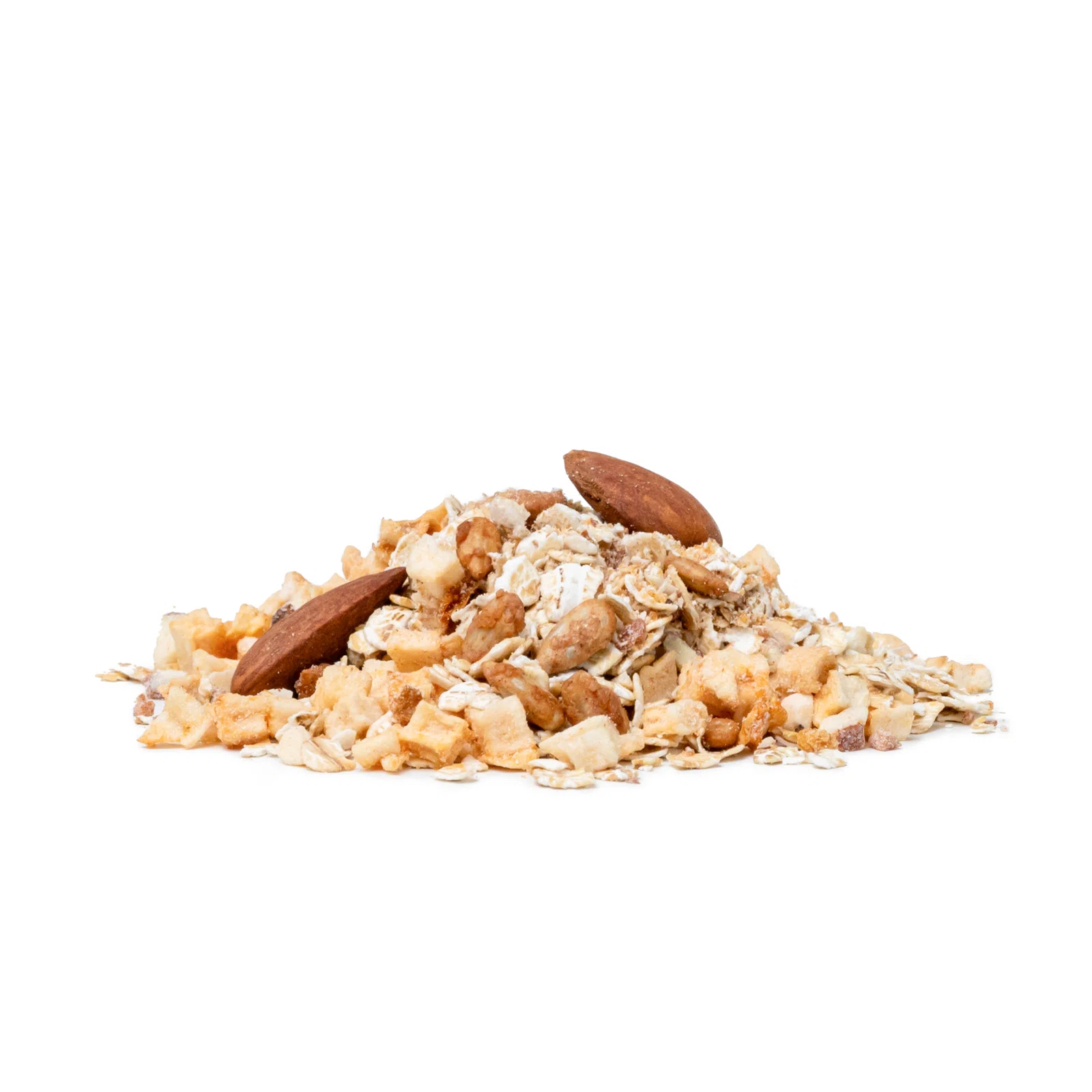 | Składniki: | bezglutenowe płatki owsiane z kiełkami 47 %, kawałki migdałów w cynamonie 28 % (migdały 76 %, cukier, cynamon 3,5 %), suszone jabłka 12 %, suszony sok trzcinowy, nasiona słonecznika w cukrze i cynamonie (nasiona słonecznika 76 %, cukier, cynamon 3,5 %). |