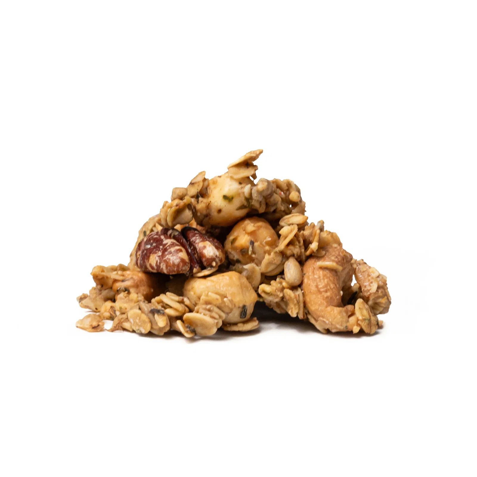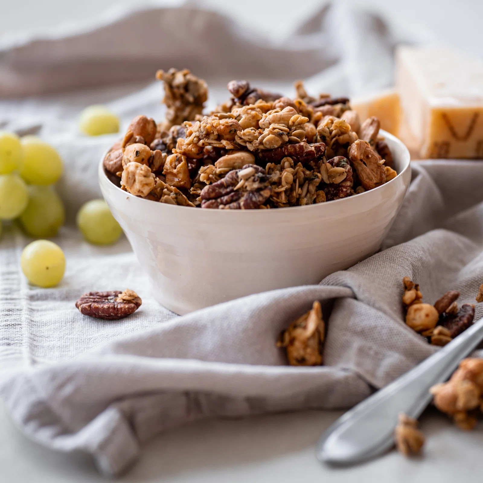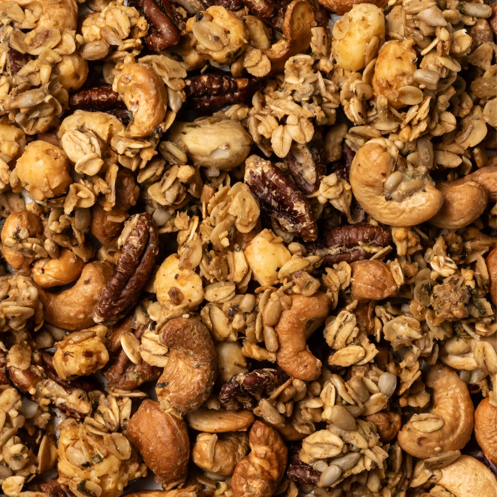 Połączyliśmy bezglutenowe płatki owsiane, orzechy nerkowca, pekany, nasiona słonecznika, suszoną goudę, suszony cheddar, oliwę z oliwek, szczyptę soli himalajskiej i mieszankę przypraw – w tym bazylię, oregano i czosnek niedźwiedzi. Wszystko upiekliśmy i gotowe! Chrupiący, serowy mix z orzechami gotowy do chrupania. Smakuje nam – i Tobie też będzie!