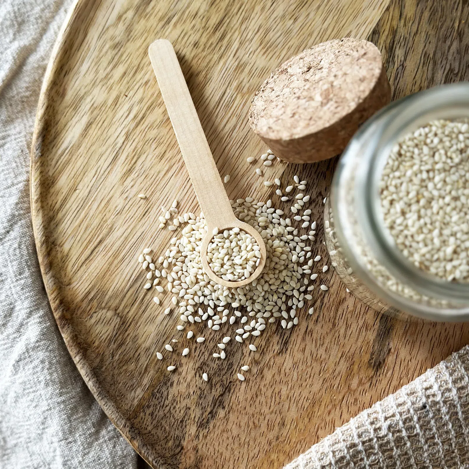Wierz lub nie, ale istnieje wiele sposobów na spożywanie nasion sezamu. Dlatego warto mieć w domu odpowiedni zapas prażonego łuskanego sezamu. Możesz go wykorzystać do przygotowania szybkiej przekąski w postaci domowej mieszanki z orzechami i suszonymi owocami. Można go dodać do zupy, risotto lub jogurtu czy owsianki. Jeśli lubisz piec, spróbuj dodać prażone nasiona sezamu do ciasta na chleb lub użyj ich przy produkcji słodkiego kremu. Dobrym pomysłem jest również dodanie prażonego łuskanego sezamu do domowej granoli. Wystarczy wymieszać płatki owsiane, nasiona (np. sezam), orzechy i suszone owoce. Dodaj syrop, olej i piecz w 110°C przez około 60 minut, pamiętając o mieszaniu co jakiś czas. To świetny pomysł, bo taki sezam oprócz szerokiego zastosowania zawiera wiele korzystnych dla zdrowia składników – takich jak wapń, żelazo, magnez czy witaminy z grupy B.