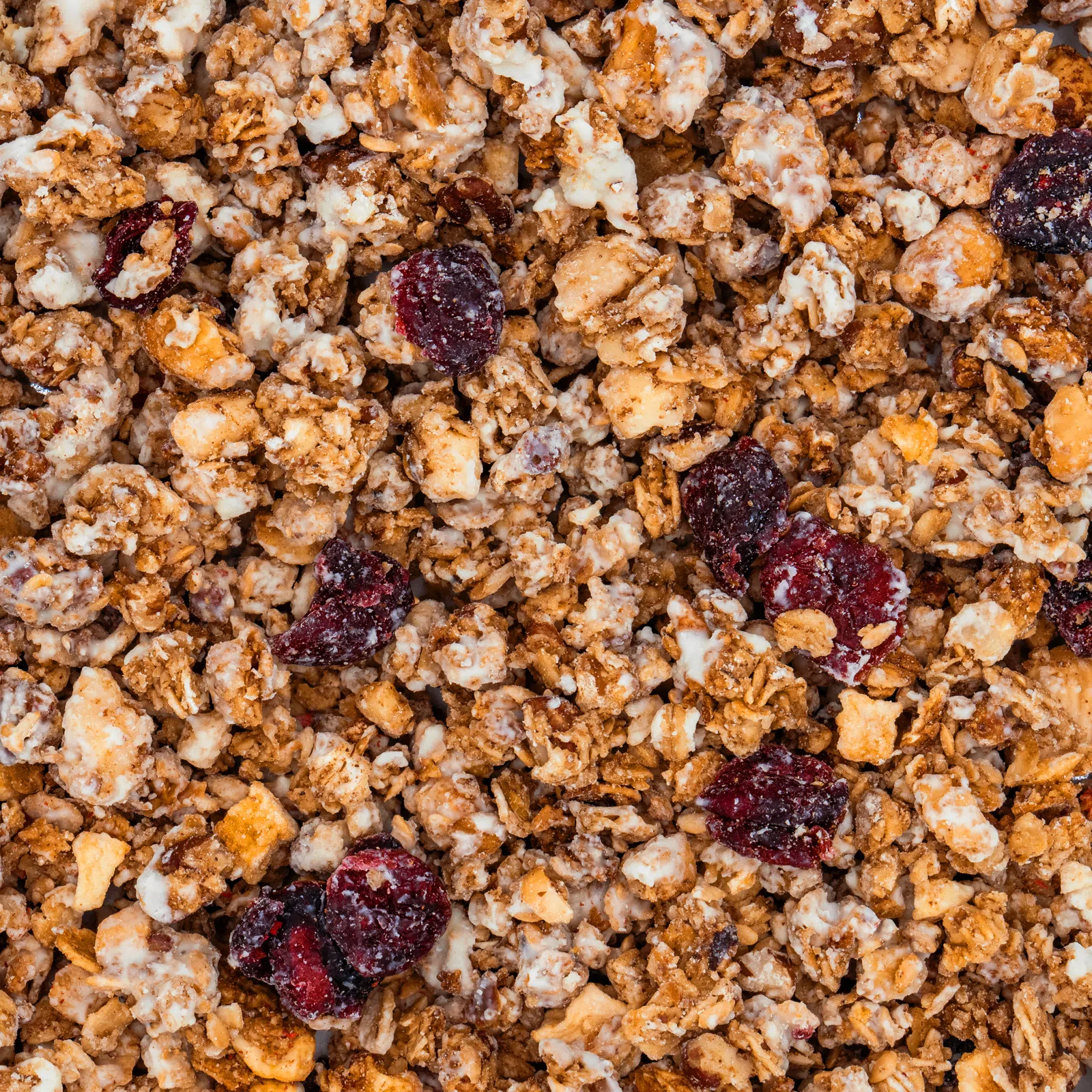 | Składniki: | płatki owsiane bezglutenowe 25 %, belgijska biała czekolada 21 % (cukier, masło kakaowe, pełne mleko w proszku mleko, emulgator: lecytyna sojowa; naturalny aromat waniliowy), miód kwiatowy, orzechy pekan 11 %, migdały łuskane 11 %, żurawina 6,2 % (żurawina 60 %, cukier trzcinowy, olej słonecznikowy), mus jabłkowy, siemię lniane złote, suszone jabłka, przyprawa piernikowa 0,3 % (cynamon Cassia, anyż, goździki, kardamon, kolendra), mielony cynamon. |