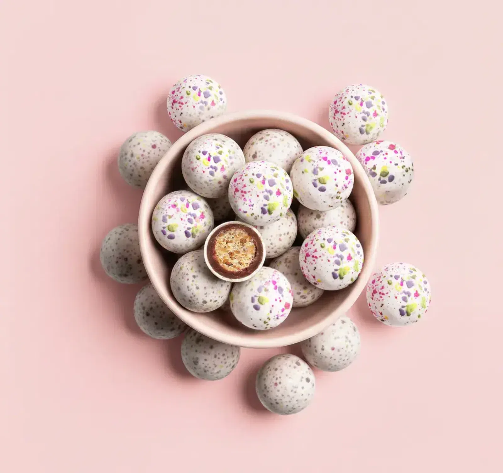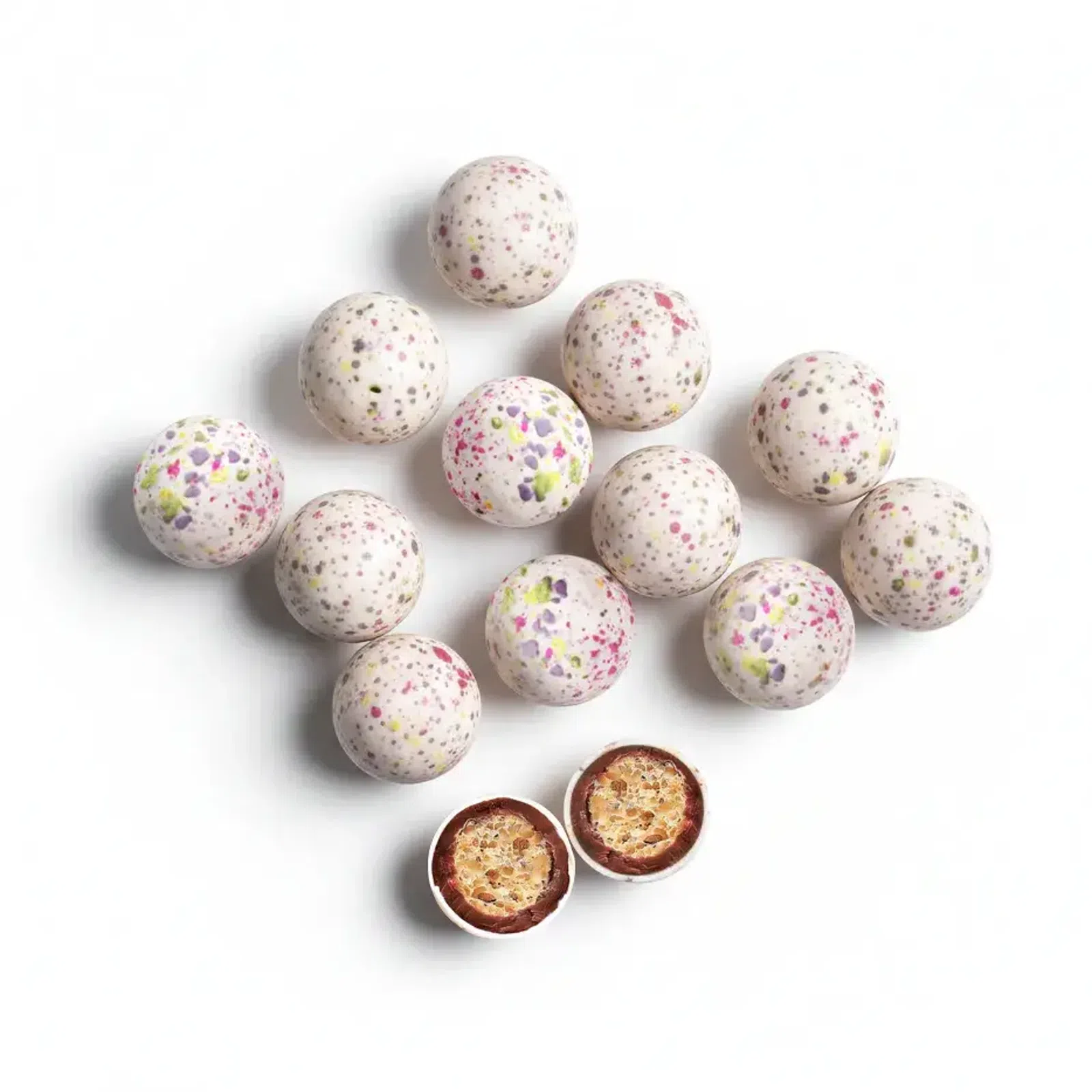 Małe kuleczki pełne wiosny i radości. Wielkanocne chrupiące drażetki kryją lekką chrupkość, otuloną solidną warstwą mlecznej czekolady i chronioną twardą cukrową skorupką. Każda kuleczka mieni się barwami wiosny i oferuje idealnie zbalansowane połączenie chrupkości oraz czekoladowej delikatności. Idealny wielkanocny upominek dla kolędników, słodka dekoracja świątecznego stołu i radosna przekąska do podjadania w domu. Bo Wielkanoc smakuje najlepiej, gdy jest kolorowa i chrupiąca.
