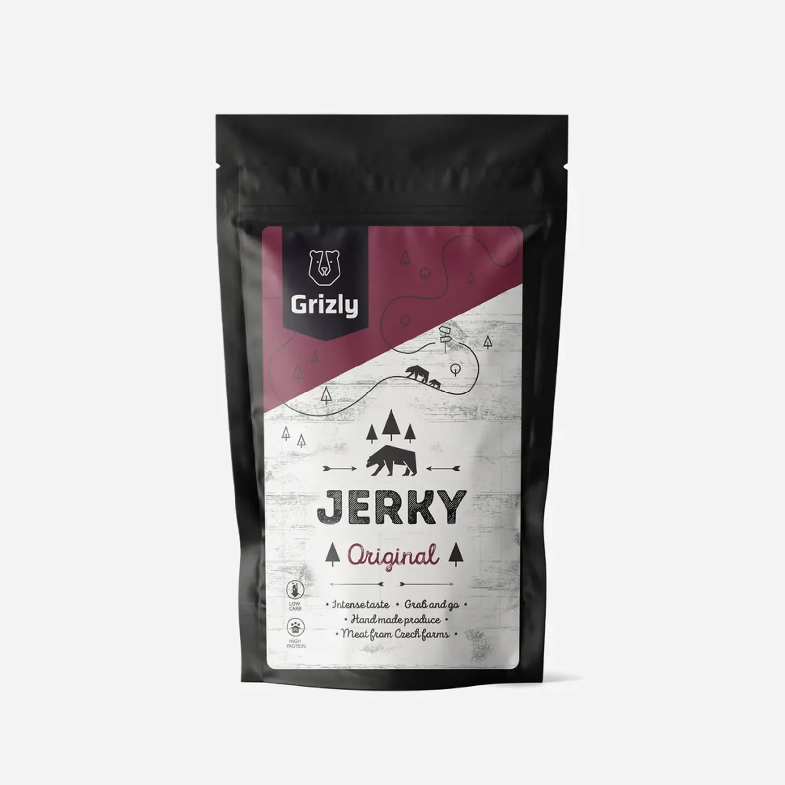 Oryginalna suszona wołowina GRIZLY jest pełna intensywnego smaku, bez barwników, konserwantów i chemii. Metoda suchego mięsa.