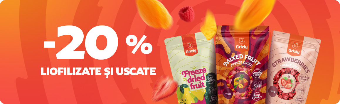 Odată ce vei gusta fructele noastre liofilizate, nu vei mai dori altceva. Datorită uscării prin congelare blândă, fructele liofilizate GRIZLY sunt pline de vitamine și nutrienți, la fel ca și căpșunile proaspete. În plus, sunt crocante, deoarece procesul de liofilizare le-a îndepărtat apa. Și, pentru că le ambalăm în pungi resigilabile, își păstrează această calitate.